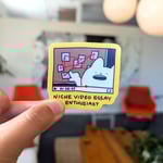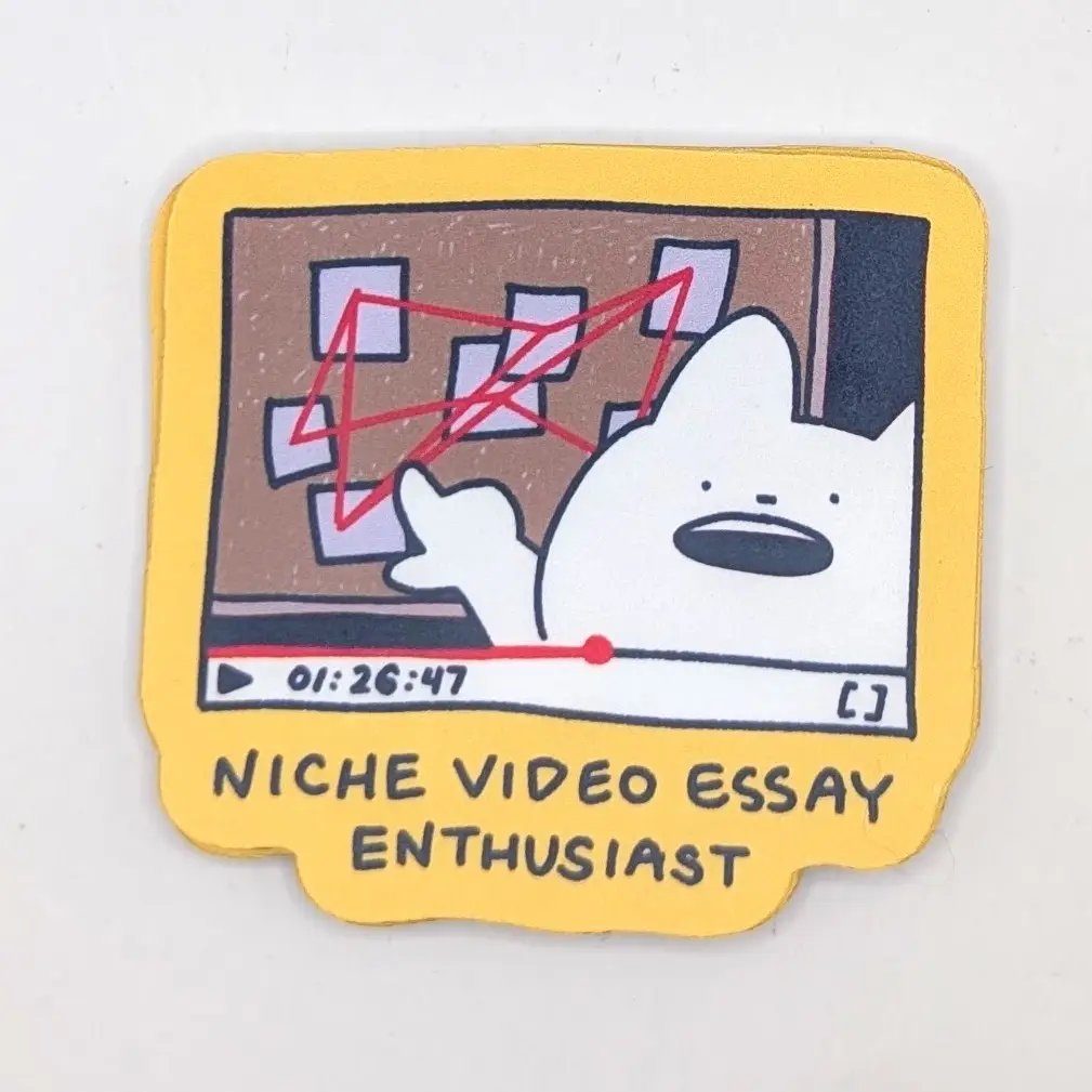 This waterproof vinyl sticker features a frantic cartoon cat mid–video essay, complete with a red string conspiracy board and timestamped YouTube-style frame. Perfect for media nerds, film buffs, or anyone who’s ever watched a 90-minute deep dive on something wildly specific. A fun gift for your friend who starts every sentence with “Actually, there’s a whole video about this.”