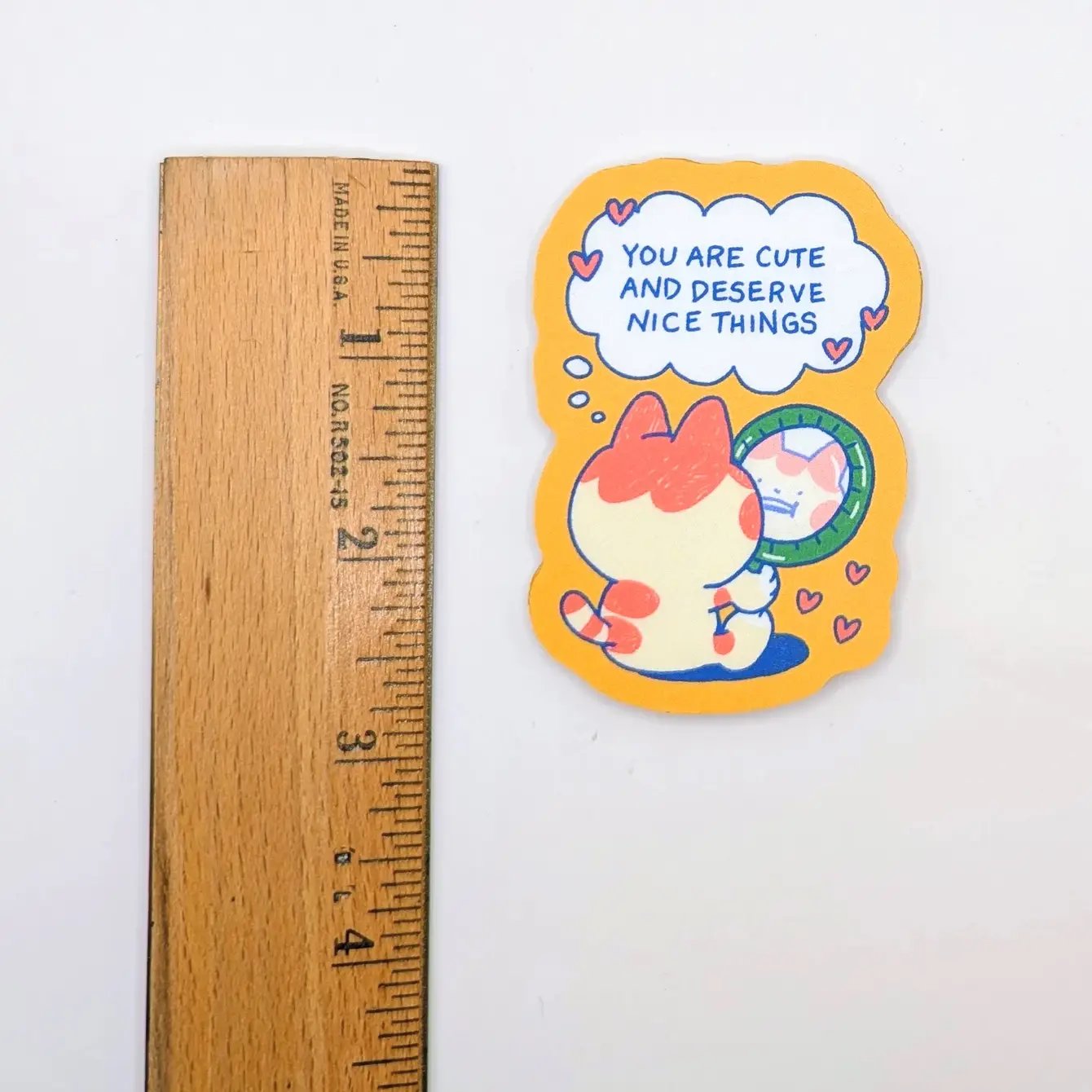 Give yourself (or a friend) a little daily boost with this "You Are Cute and Deserve Nice Things" vinyl sticker! Featuring an adorable chubby cat gazing into a mirror with a sweet self-affirming message, this sticker is the perfect reminder to practice self-love and kindness. The warm, cozy color palette and playful design make it an uplifting addition to your laptop, water bottle, journal, phone case, or anywhere you need a dose of encouragement.